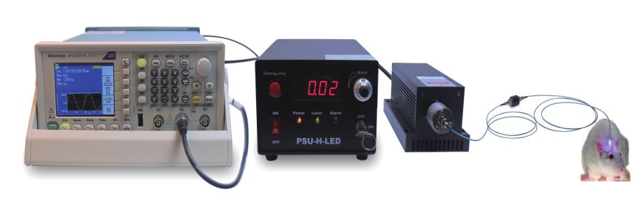 传统光遗传系统包括激光器、波形发生器、光纤跳线、陶瓷插针等多个部件。这要求实验者需要具有一定的专业知识背景,能自行组合多个部件来搭建光遗传实验系统组建实验平台,这种操作方式不仅实验参数设置繁琐、实验条件无法精确控制、实验系统维护也是困难重重。