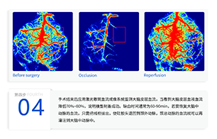 第4步手术结束后应用激光散斑血流成像系统监测大脑皮层血流,当看到大脑皮层血液血流降低70%~80%,说明模型制备成功。 - 若要恢复大脑中动脉的血流,只需把线栓拔出,使硅胶头退回到颈外动脉,颈总动脉的血流就可以再灌注到大脑中动脉中。