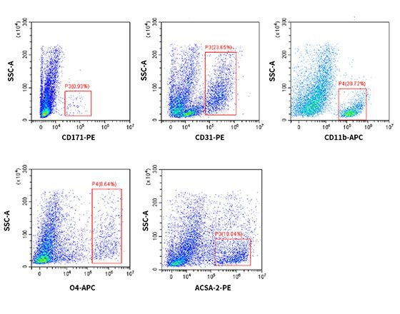 流式检测结果显示该试剂盒能分离出神经元、内皮细胞、小胶质细胞、少突胶质细胞与星形胶质细胞,基本涵盖脑组织所包含的细胞类型,且能够保障细胞表面抗原标志物的保留。