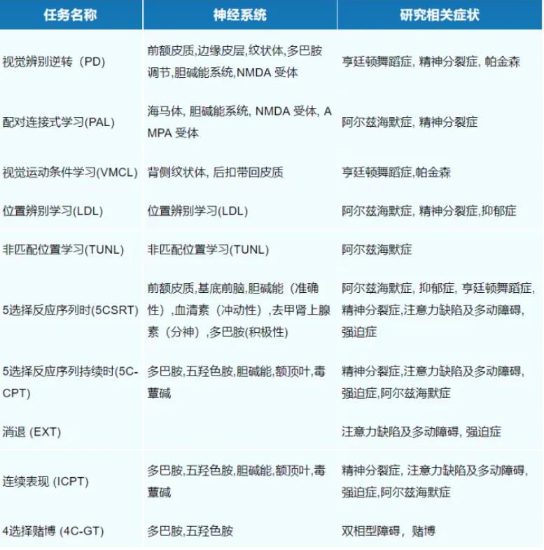 本任务要求啮齿动物对5个位置中随机1位置出现的短暂视觉刺激做出响应,随着短暂刺激时间的缩短,对动物注意力的要求越来越高。此任务对皮质层处理能力敏感,特别是那些涉及到前额皮质和高度依赖胆碱能传递的功能方面。
