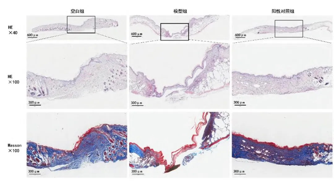 实验终点,取创面及周围正常皮肤组织,进行病理检查。使用HE染色等染色方法观察创面表皮细胞爬行、肉芽组织新生情况。