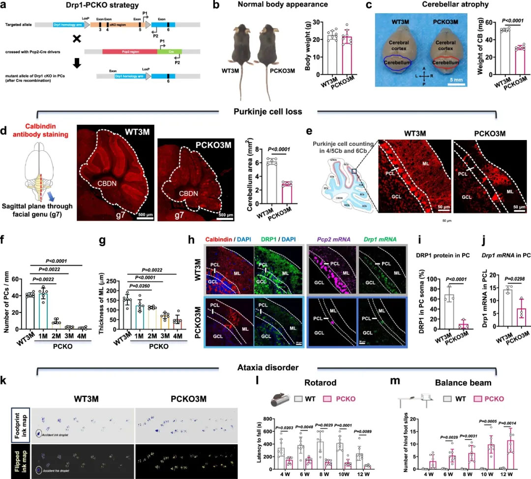 研究人员构建了两种小鼠模型:一种是条件性敲除Drp1基因的小鼠(PCKO小鼠),该基因的敲除会导致PCs发生广泛且进行性的凋亡,进而引发小脑萎缩、共济失调等症状;另一种是表达TdTomato蛋白的CBND小鼠(CBNDTdTomato小鼠),用于确保实验稳定性并排除免疫荧光染色的干扰。通过对这些小鼠的观察和检测,研究人员发现PCKO小鼠在3个月大时,小脑萎缩明显,PCs数量显著减少,同时伴有运动功能障碍和神经胶质细胞激活。CBNDTdTomato小鼠也呈现出类似的PCs退化和小脑萎缩现象,且运动功能在1个月大时就出现异常。