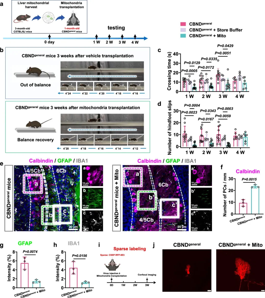 研究发现,移植线粒体的1月龄CBNDgeneral小鼠和CBNDTdTomato小鼠在运动功能上有显著改善,表现为平衡木测试中通过时间缩短、后足滑倒次数减少,同时PCs数量增加,小脑萎缩得到缓解。不过,这种治疗效果在成年CBNDgeneral小鼠中并不明显,这提示足够数量的PCs对于线粒体移植发挥治疗作用至关重要。